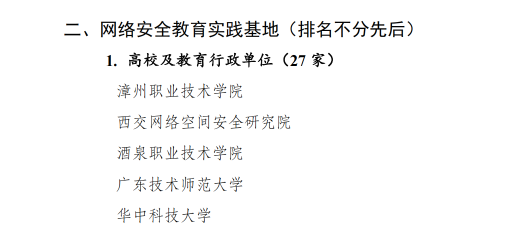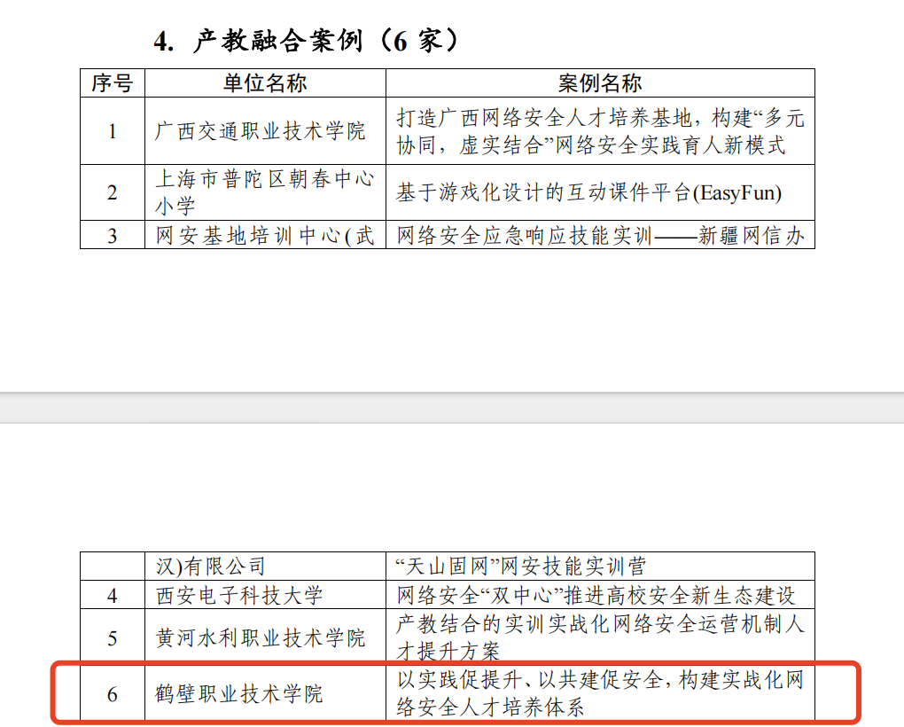网络安全教育实践优秀案例共分为人才培养、防护实践、宣传教育、产教融合等四类案例,共评选出39个实践优秀案例,其中有8所高职院校,入选产教融合案例的6家单位。网络安全教育实践基地共有27家高校及教育行政单位入选,其中高职有8所。
