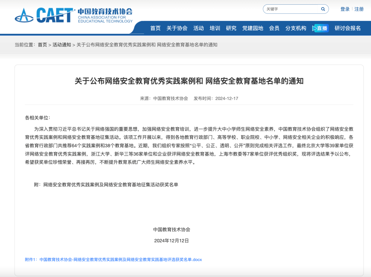 中国教育技术协会开展网络安全教育优秀实践案例和网络安全教育基地征集活动,旨在深入贯彻习近平总书记关于网络强国的重要思想,加强网络安全教育培训,进一步提升大中小学师生的网络安全素养。公司必威BETWAY西汉姆联高度重视,精心组织,积极准备申报材料,斩获两项殊荣。