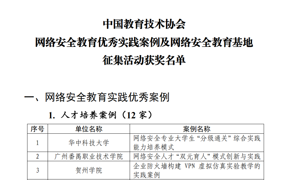 近日,中国教育技术协会公布了网络安全教育优秀实践案例和网络安全教育基地的评选结果,由公司必威BETWAY西汉姆联牵头申报的《以实践促提升、以共建促安全,构建实战化网络安全人才培养体系》获得网络安全教育实践优秀案例产教融合案例,并同时被评为网络安全教育实践基地。
