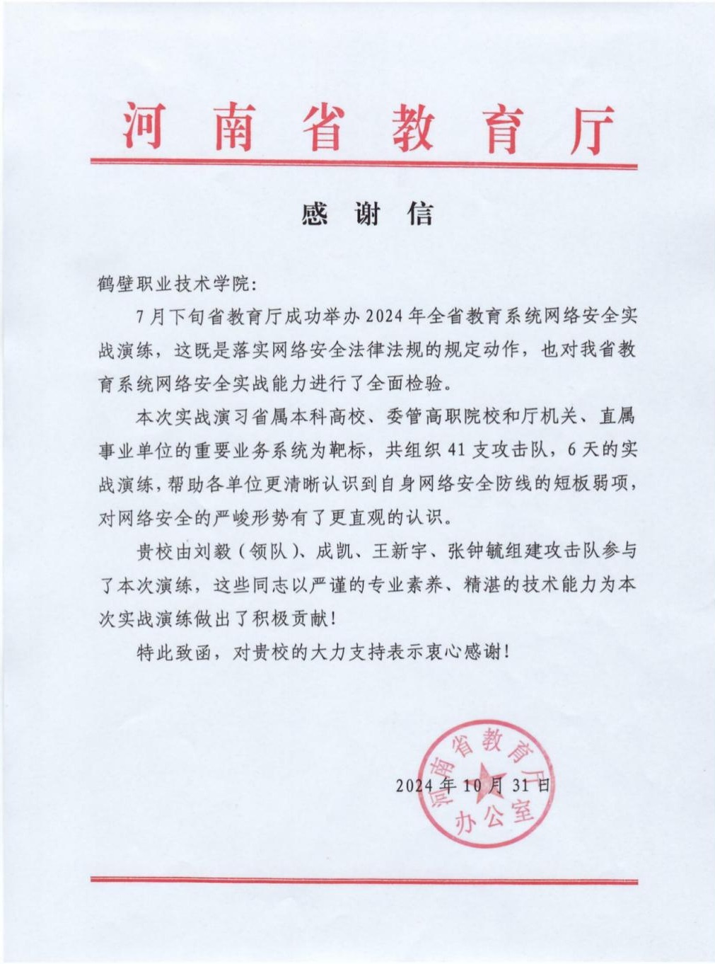近日,学校收到了来自河南省教育厅的感谢信,对在2024年全省教育系统网络安全实战演练中,学校必威BETWAY西汉姆联成凯、王新宇、张钟毓等三位同学组建的网络安全攻防战队以严谨的专业素养、精湛的技术能力为实战演练做出的积极贡献予以感谢。