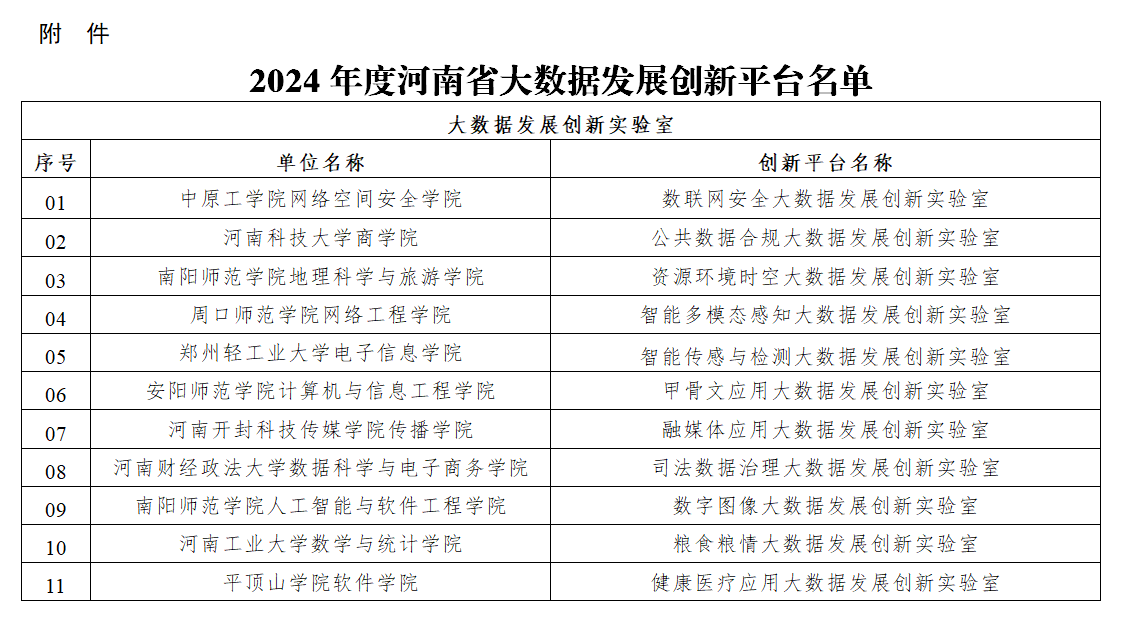 河南省大数据发展创新平台是为深入贯彻落实省委、省政府数字化转型战略,聚焦“7+28+N”产业链群,推动大数据技术创新与应用而设立的科创平台,旨在通过汇聚优质创新资源,推动数据要素赋能新型工业化,加速大数据技术研发与成果转化,促进全省大数据产业高质量发展,为我省乃至全国数字化转型和产业升级提供强大动力。学校此次获批省级大数据产业融合创新中心,既是河南省大数据产业发展行动计划的重要组成部分,也是学校积极响应政策号召、推动大数据产业发展的具体实践。