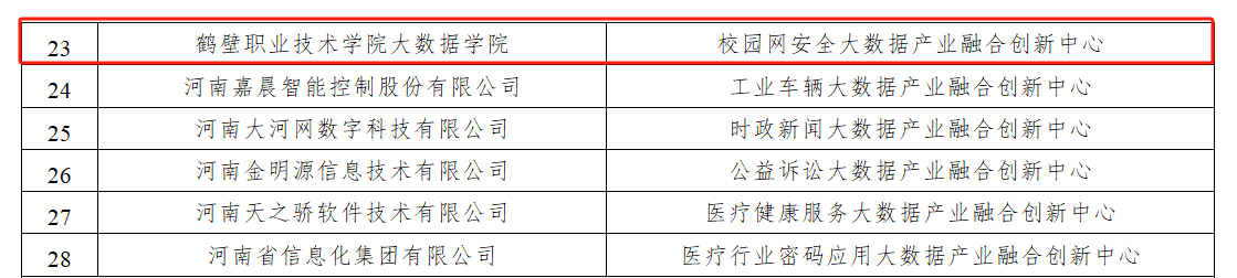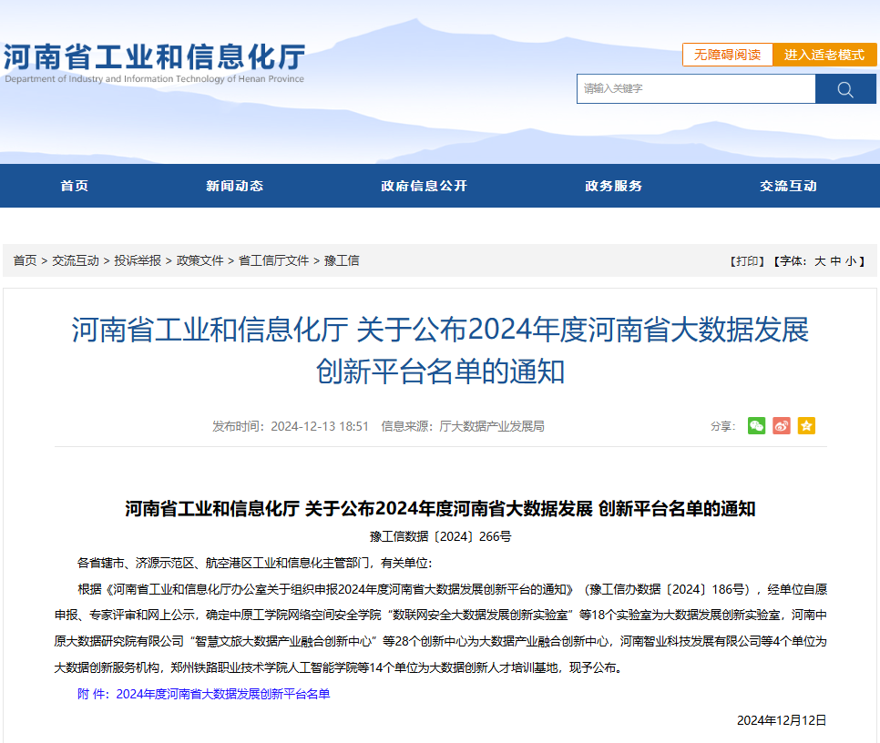 12月12日,河南省工业和信息化厅发布了《河南省工业和信息化厅关于公布2024年度河南省大数据发展创新平台名单的通知》,学校必威BETWAY西汉姆联牵头申报的“校园网安全大数据产业融合创新中心”被认定河南省大数据产业融合创新中心,这是学校首次获批省级大数据发展创新平台,也是自2022年此项工作开展以来,全省唯一入选大数据产业融合创新中心的高职院校。