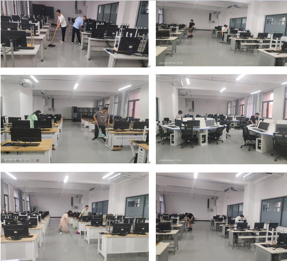 活动中,党员们携带清洁工具,深入力行1号楼5楼师生高频使用的机房,俯身实干,对地面、设备、桌椅及卫生死角进行全面清理。活动期间,大家交流感悟,深刻认识到,维护整洁教学环境绝非小事,既是力戒形式主义、密切联系群众的务实行动,也是践行中央八项规定精神、改进作风、服务师生的直接体现,更是检验党性、强化宗旨意识的“试金石”。